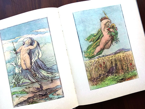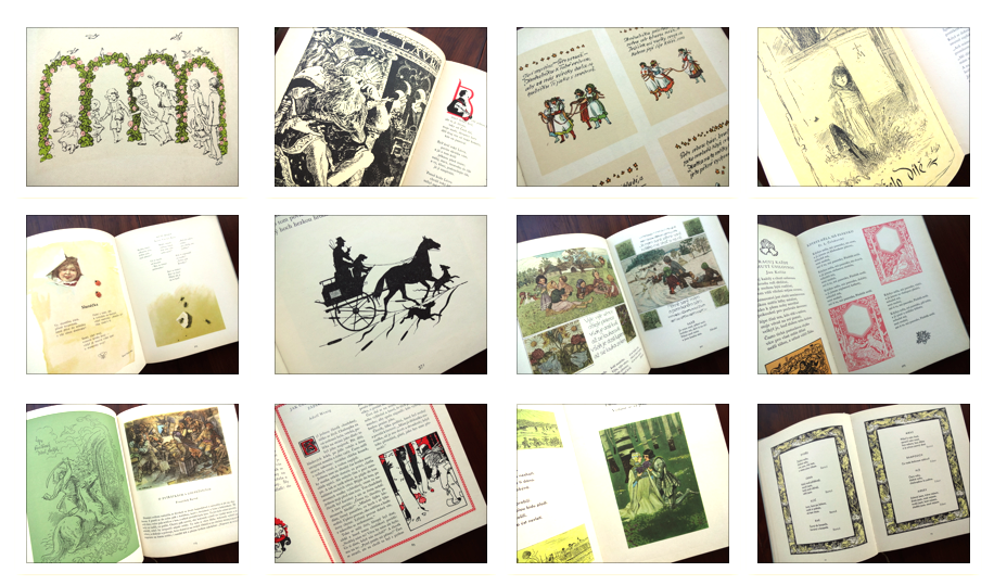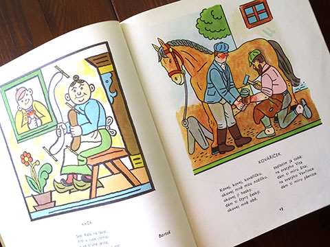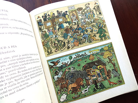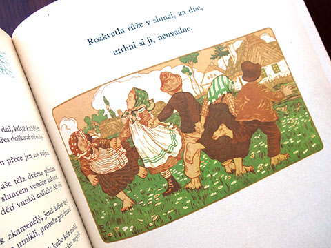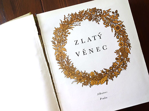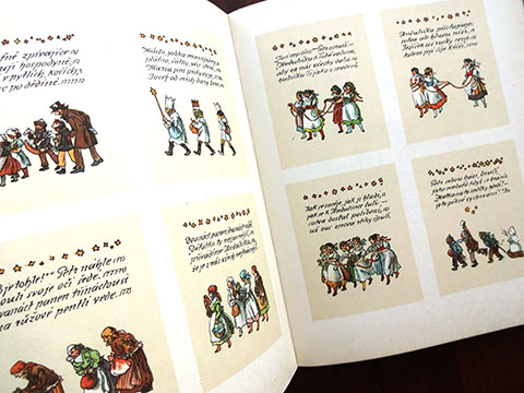 チェコスロバキアの多様な童話・童謡が多数収められた豪華な童話・童謡集(1973年版)。以前、本書の姉妹編「Novy ZIaty Venec」をご紹介したことがありますが、タイトルにあるNovyとは新しいという意味で、主に1950年代以降の作品のアンソロジーでした。本書では、1950年代以前(19世紀後半〜)の作品が編まれており、その後”絵本大国”とまで言われるようになった彼の国の、児童書文化の厚みとその歴史を感じ取ることができます。図版多数、多様なレイアウト・デザイン、味わいのある紙に、よく馴染んだインク・・・豊富なコンテンツで多様なタッチの挿画を十二分に味わうことができる稀少本です。扉を開いて一番最初に目に飛び込んでくるのはLadaの作品。Ladaは「Novy ZIaty Venec」の方にも掲載されていました。チェコの国民的な作家であるLadaの作品には、多めにページが割かれているようです。